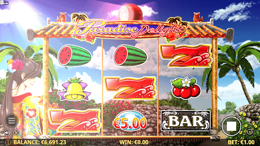 PARADISE DELIGHT has a 3x3 reel layout with 5 paylines and unlimited FREE SPINS.